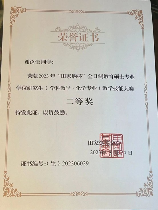 带着课题组的期许、老师们的指导,最终谢汝佳同学取得2023年全国“田家炳杯”全日制教育硕士专业学位研究生学科教学(化学)专业教学技能大赛二等奖的优异成绩!